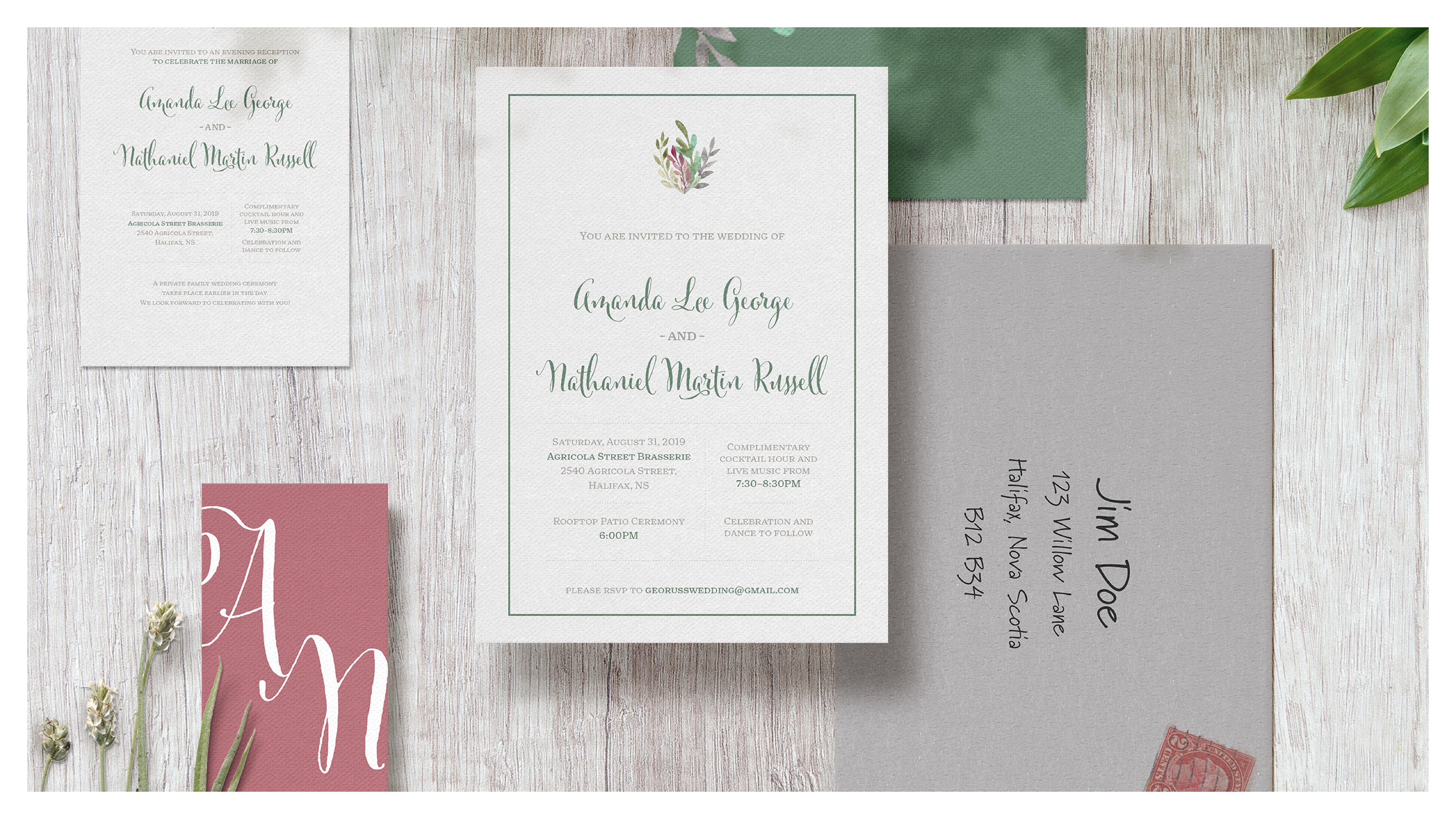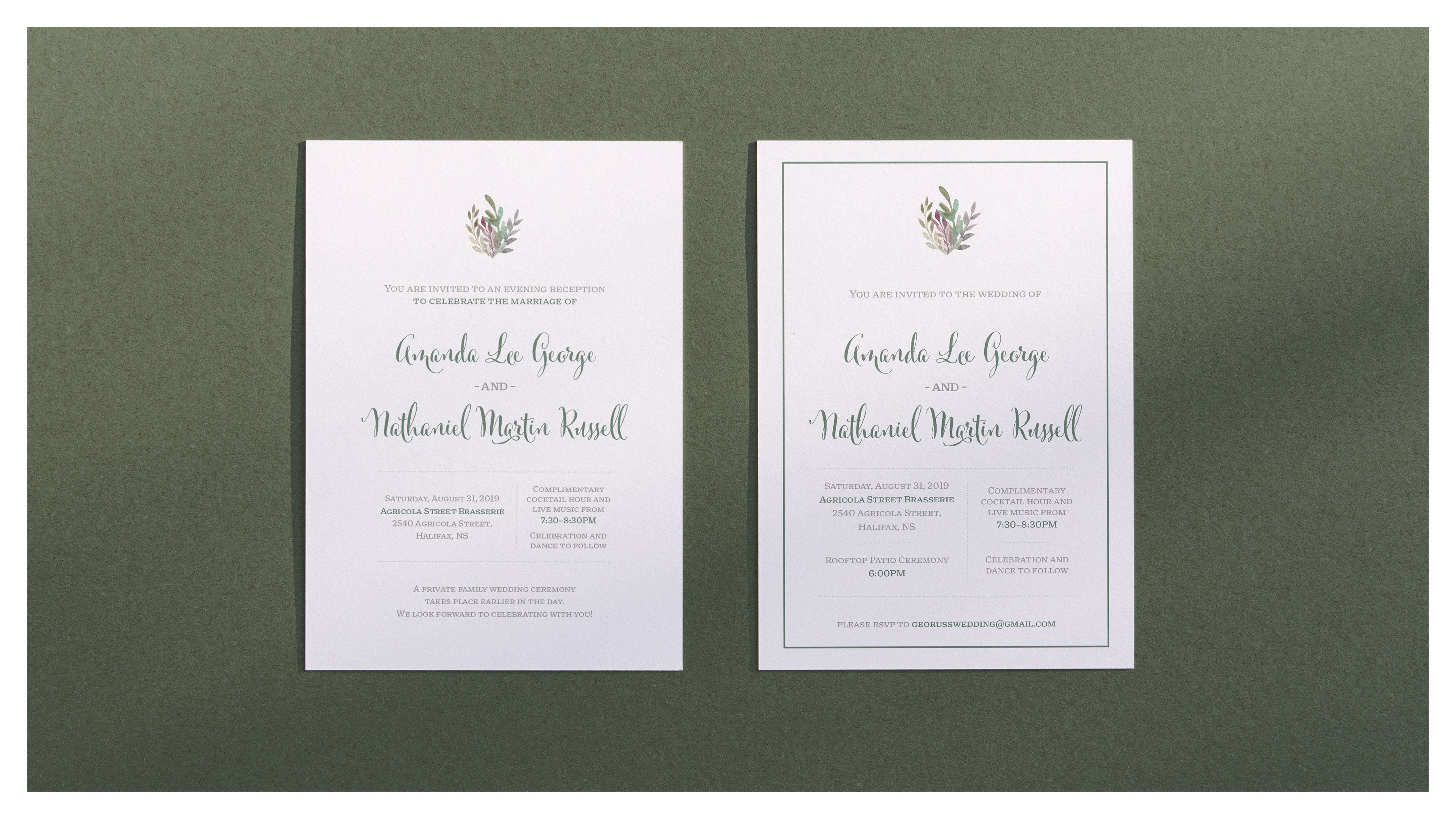 A set of wedding invitations for two very special people—with a cool, calm, natural aesthetic.